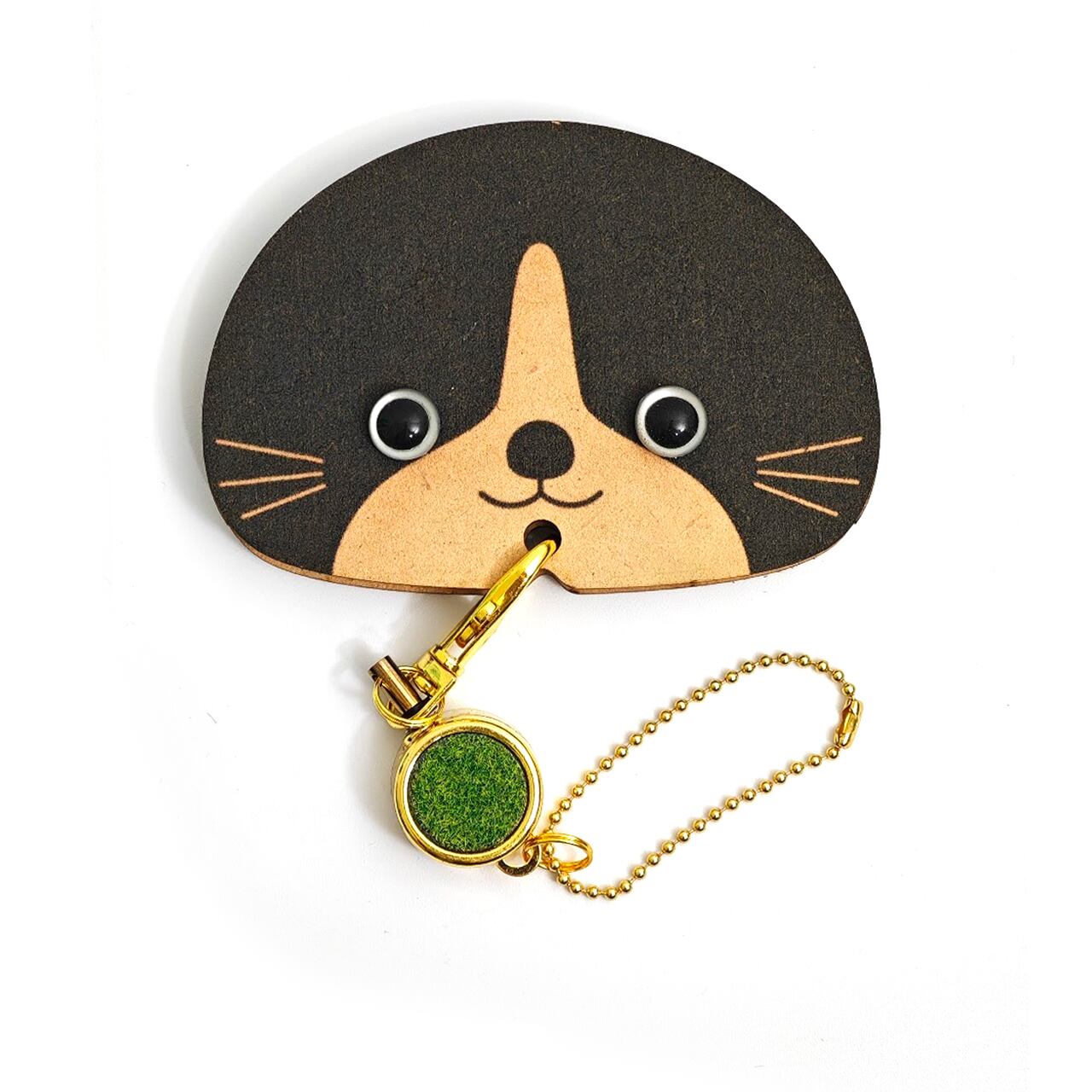 MDF(木材)で作られたナチュラルな風合いのデザインに、愛らしいねこのお顔をプラス。シンプルながらも、ひとつひとつ違う個性が光るアイテムです。
